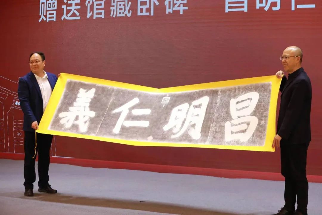 孔庙和国子监博物馆馆长吴明代表北京孔庙赠送馆藏卧碑“昌明仁义”拓片一幅。衢州市文化广电旅游局党委委员、衢州南孔文化发展中心主任盛雄生先生代表接受。