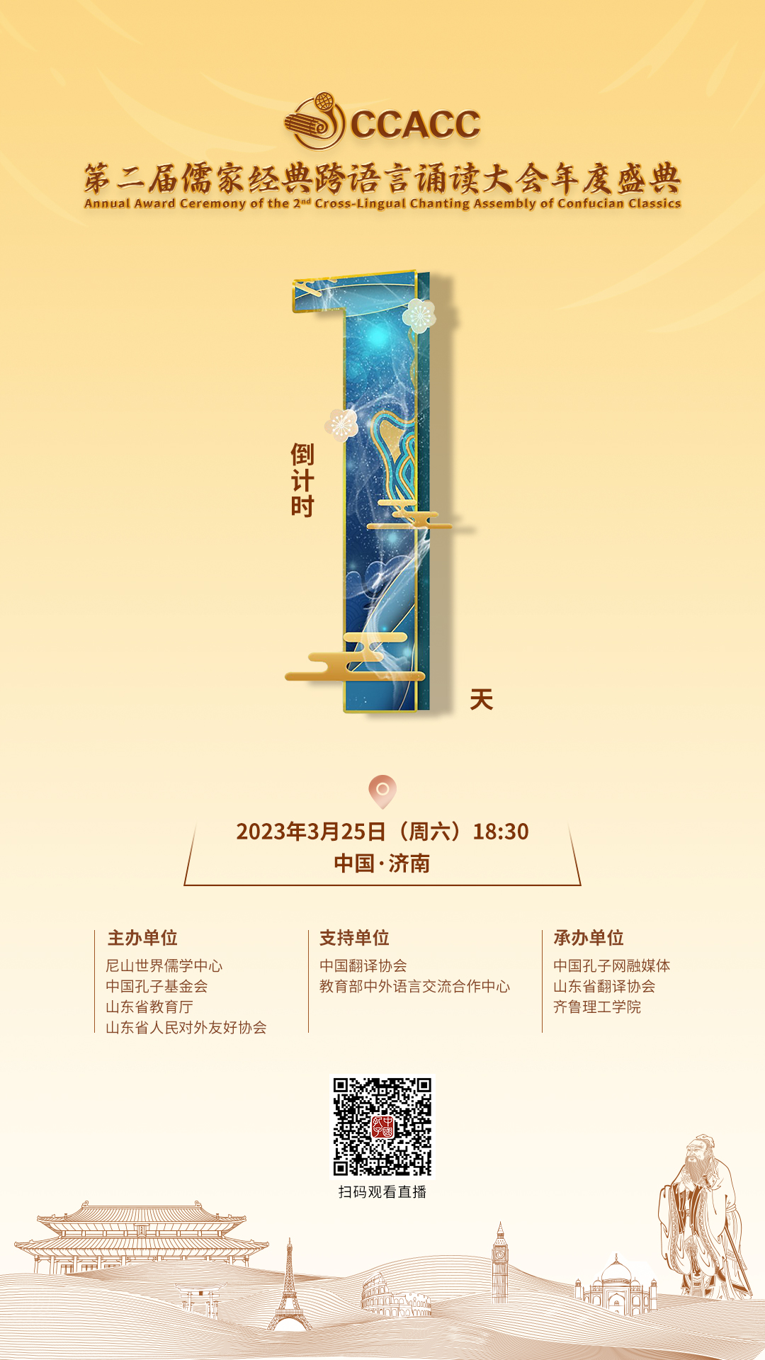 经典筑梦,和美与共。为弘扬以孔子为代表的中华优秀传统文化,提炼中华民族独特的精神标识,增进中外文明交流互鉴,讲好中国故事、传播好中国声音,尼山世界儒学中心、中国孔子基金会、山东省教育厅、山东省人民对外友好协会联合主办的“第二届儒家经典跨语言诵读大会年度盛典”将于2023年3月25日18:30在山东济南盛大启幕。