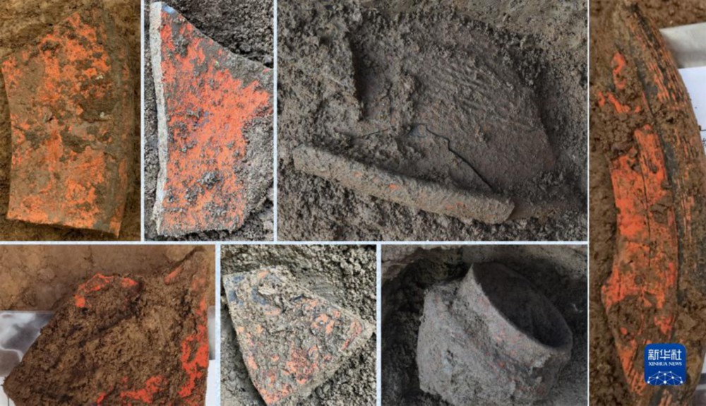 河南偃师二里头都邑西北部出土的带漆陶片(资料拼版照片)。新华社发(国家文物局供图)