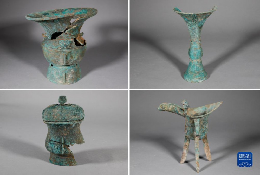 河南安阳殷墟商王陵祭祀坑K23出土的青铜器(拼版资料照片)。新华社发