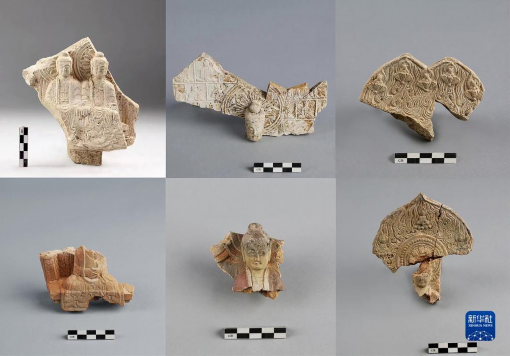 吉林珲春古城村1号寺庙址出土的佛像残片(拼版资料照片)。新华社发(国家文物局供图)