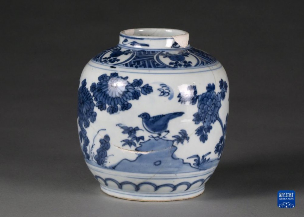 河南开封州桥及附近汴河遗址出土的明晚期景德镇窑青花花卉纹罐(资料照片)。新华社发(国家文物局供图)