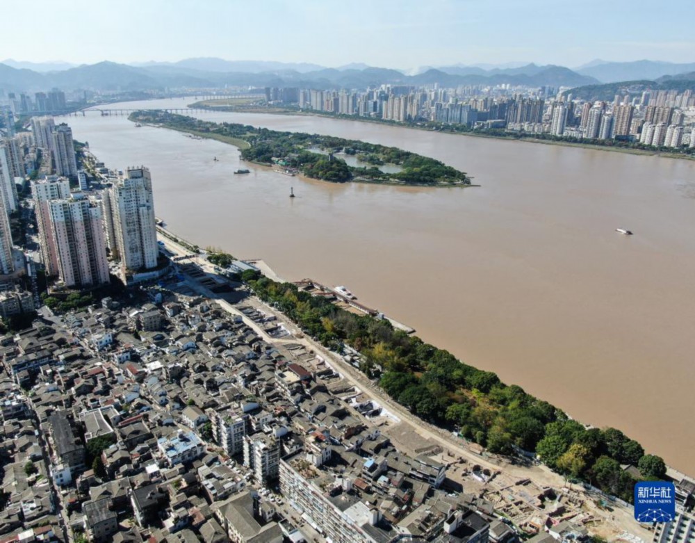 浙江温州朔门古港考古发掘现场,远处为瓯江上的江心屿(2022年10月10日摄,无人机照片)。新华社记者 翁忻旸 摄