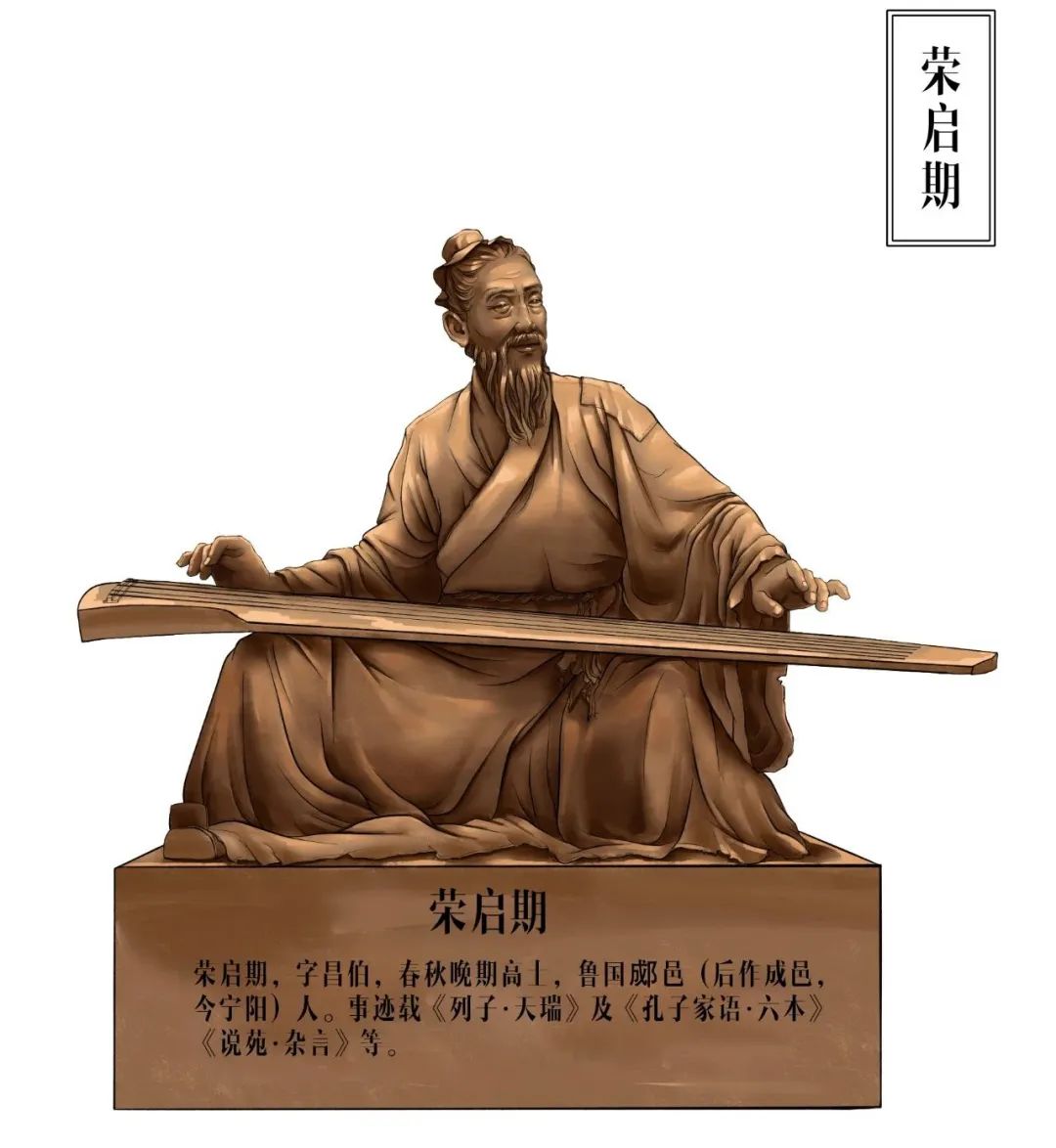 据《孔子家语》记载,孔子有次游泰山时,在路上遇见了荣启期,他衣衫褴褛,边弹琴边唱歌。