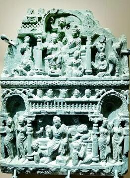 3月15日,由故宫博物院和巴基斯坦国家遗产与文化署考古与博物馆局共同主办的“譬若香山:犍陀罗艺术展”在故宫文华殿开幕。图为展出的佛教故事石雕艺术品。李韵摄/光明图片