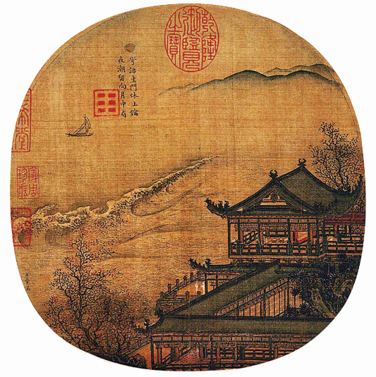 和马远不同,对于画家李嵩来说,明月高悬固然美好,然浪潮卷涌更显气势。他的画作《月夜看潮图》,江畔华美的平台阁楼上,隐约可见有人穿梭、呼指着。远山江帆、月影银涛,一幕祥和而又没有纷扰的景致。苏轼笔下的“寄语重门休上钥,夜潮留向月中看”的诗情或可从中窥探一二。