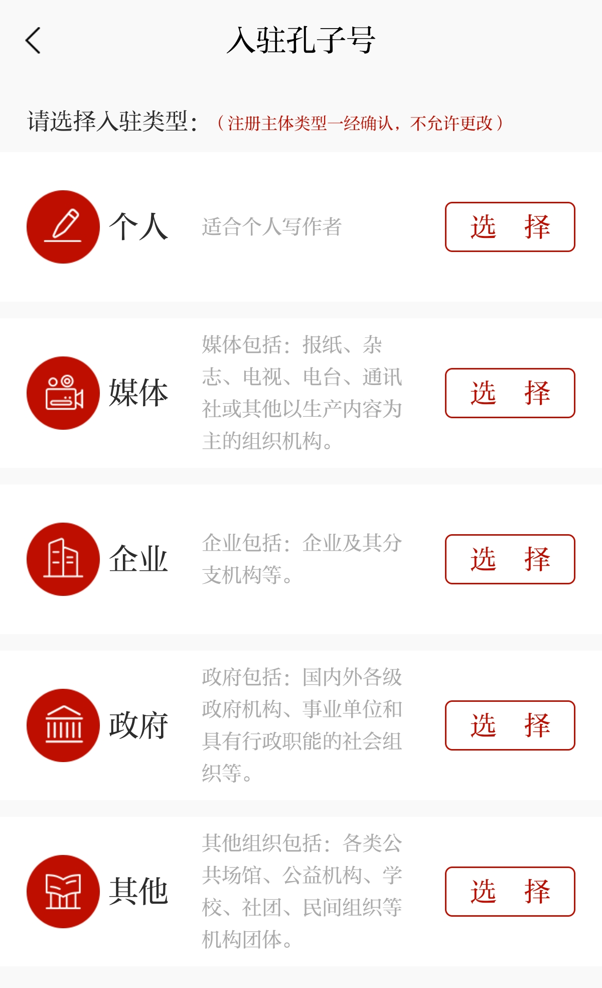 2.点击“孔子号”“入驻孔子号”,点击申请入驻,并选择入驻类型(个人/媒体/企业/政府/其他);