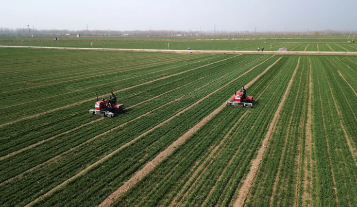 山东省汶上县,农民驾驶农机在高标准农田里进行小麦春季管护作业(2024年3月13日摄,无人机照片)。新华社记者 徐速绘 摄