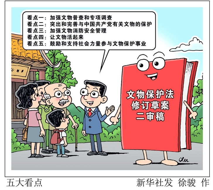 去年10月草案一审稿提请审议后,公开征求社会公众意见。草案二审稿吸纳各方面意见建议,明确了加强文物普查、加强文物消防安全管理等内容。
