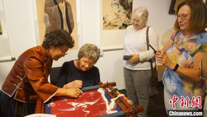 9月9日,“孔子家乡 好客山东”中国古代服饰文化展现场,鲁绣大师与观众互动。柏林中国文化中心 供图