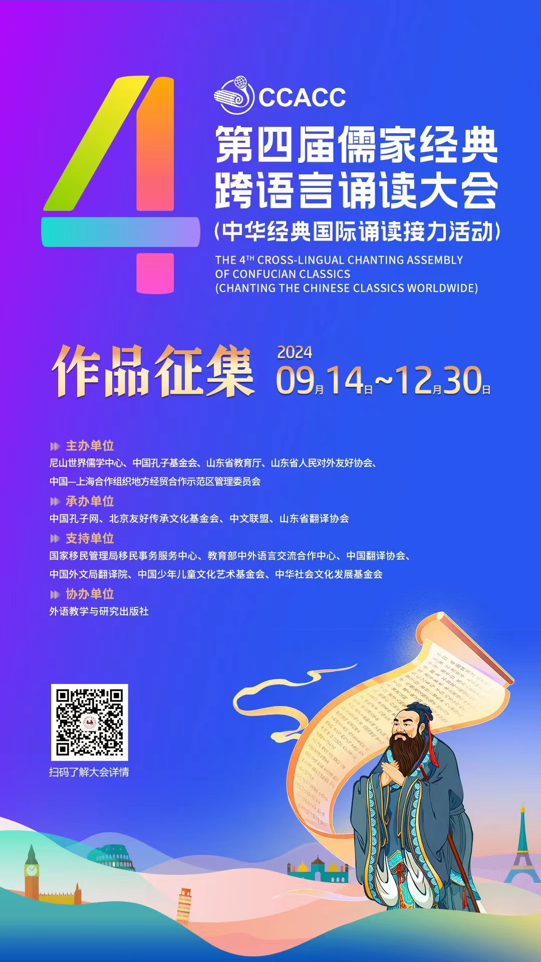 为深入贯彻落实习近平文化思想,创新中华文化传播路径,增强中华文化感召力,向世界讲好中国故事,促进世界文明交流互鉴,第四届儒家经典跨语言诵读大会(中华经典国际诵读接力活动)已于日前启动。即日起,大会面向全球征集作品。