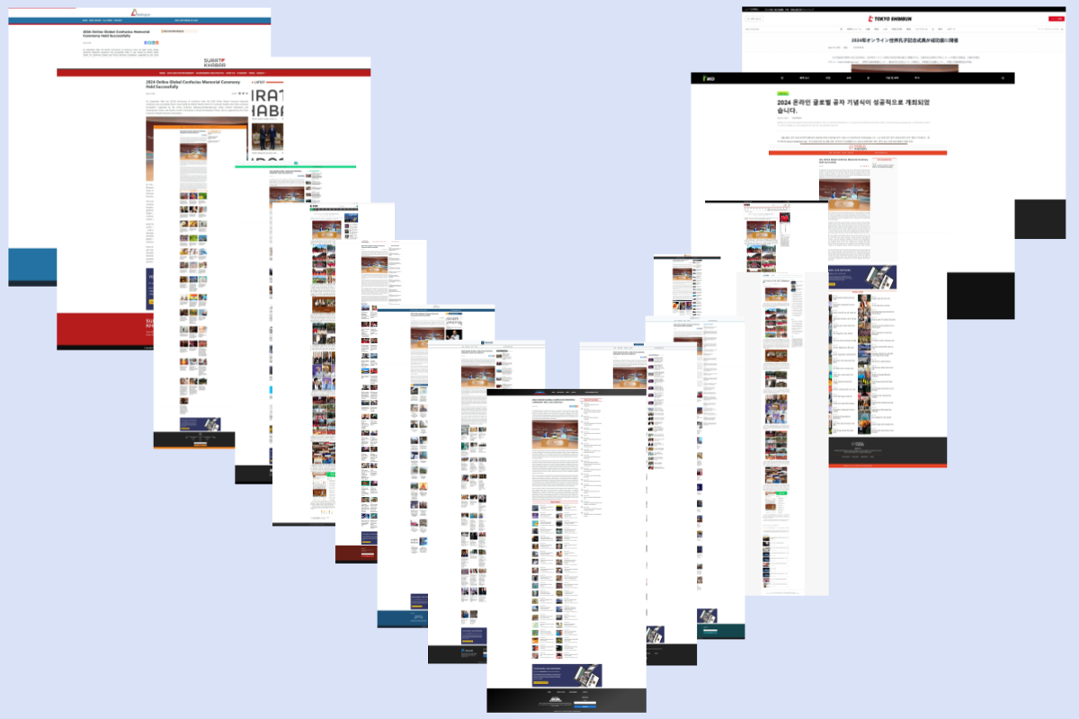 2024全球“云祭孔”引起了海外媒体的高度关注,世界内参、Futurally、先驱晨报、商业日报在线、旅行者、Weekly rebound、东盟报道等欧美媒体,東京ニュースフラッシュ、한국매일뉴스等日韩媒体,VN报导、大马角度、未来科技、KayakaWay、Bajet Harian、国际基尼网、吉隆坡之声等东南亚媒体近120家海外媒体纷纷进行转发报道,使这一盛事在世界范围内得到广泛传播,彰显了全球“云祭孔”活动的国际影响力与文化共鸣。