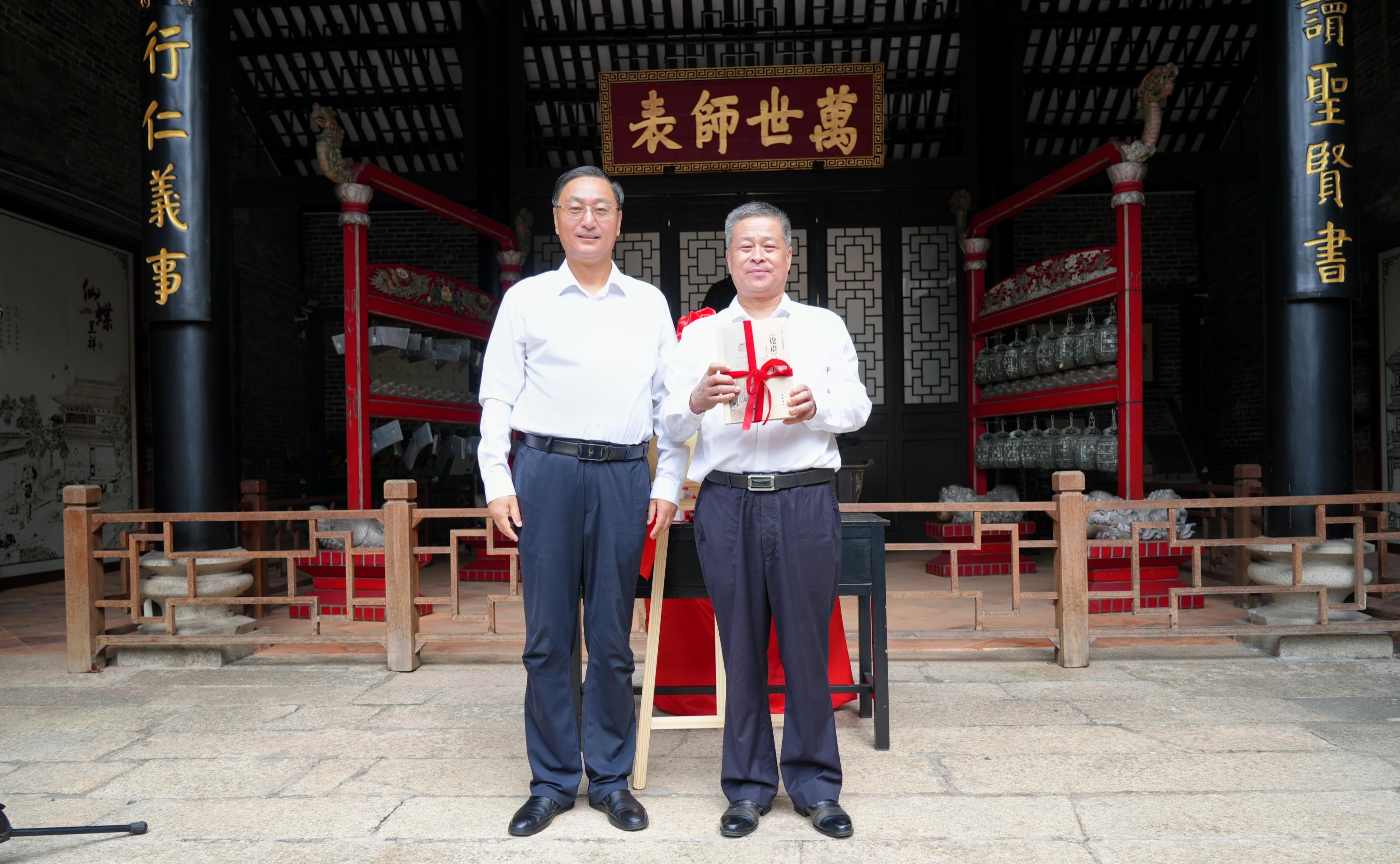 △刘皓代表尼山世界儒学中心(中国孔子基金会秘书处)向粤港澳大湾区孔子文化促进会名誉会长、广州儒释道传统文化研究院孔子学堂主任崔新文赠送传统文化丛书