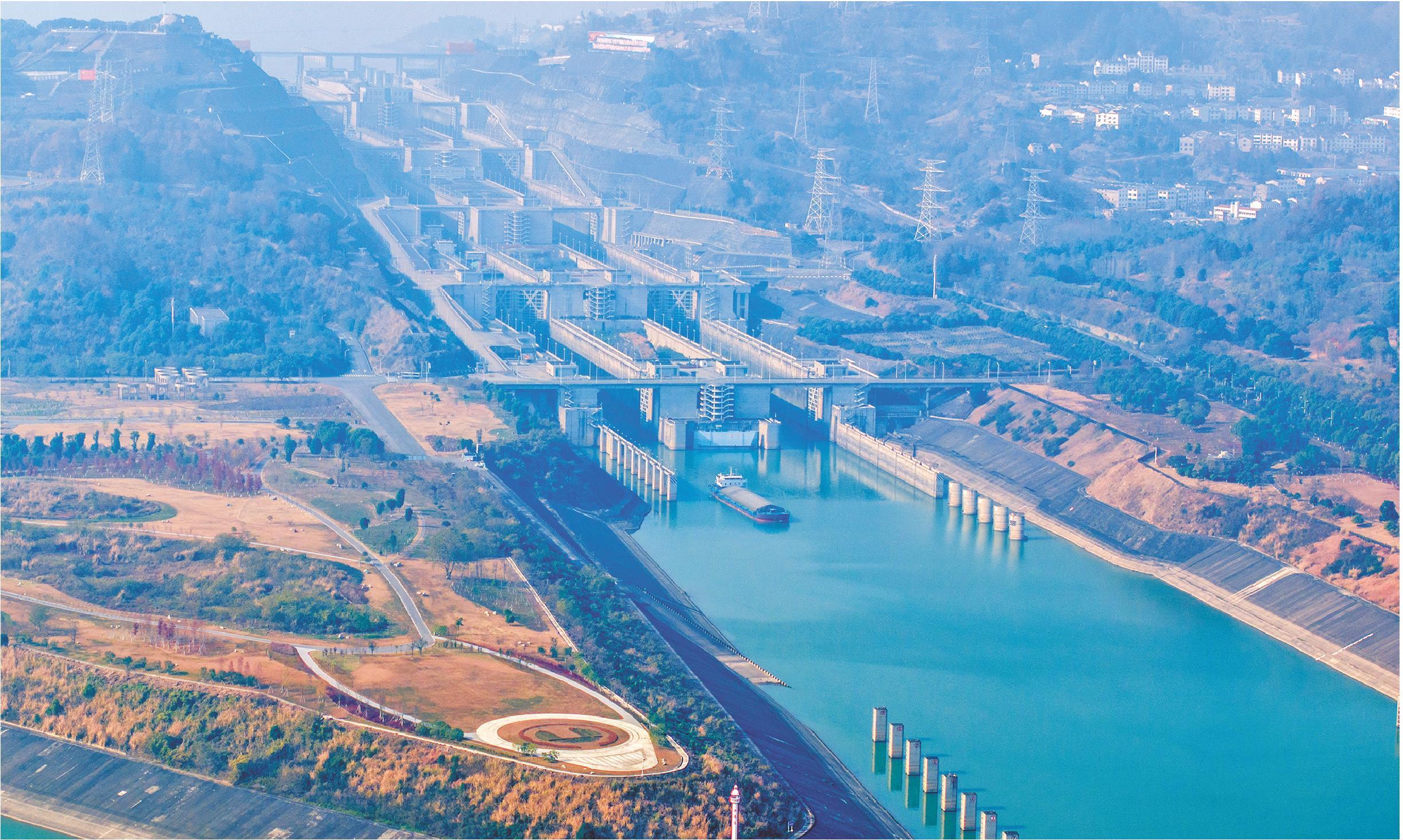 2025年1月1日,在湖北省宜昌市,船舶有序通过三峡枢纽五级船闸。数据显示,2024年,三峡枢纽航运效益高位稳定,通过量达1.59亿吨,超预期目标。□新华社发