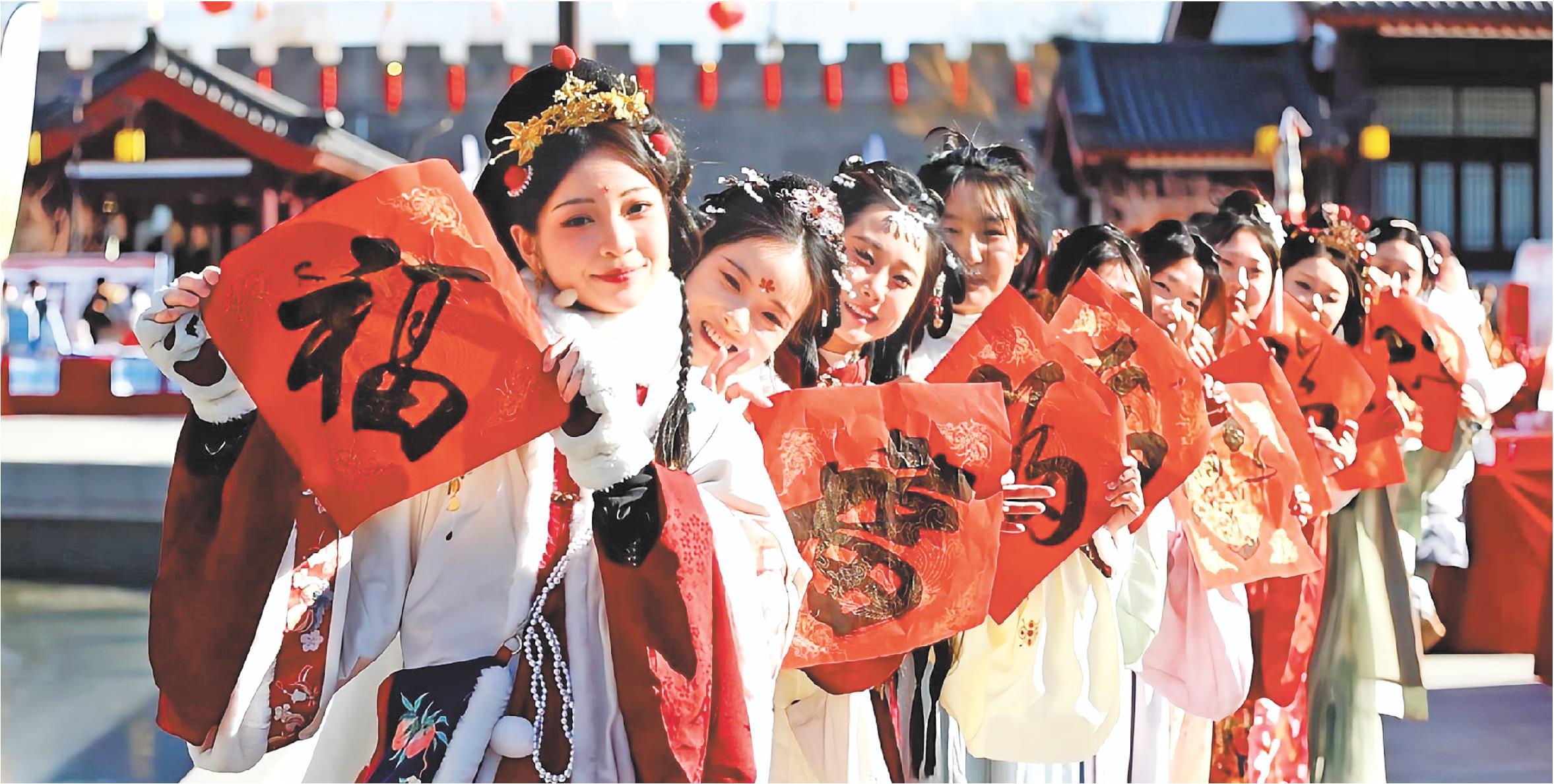 □记者徐付彪通讯员何畔报道 日前,2025德州“运河大集”新春季在庆云文博园启动。大集上,身穿汉服的年轻女子向人们展示各种“福”字。
