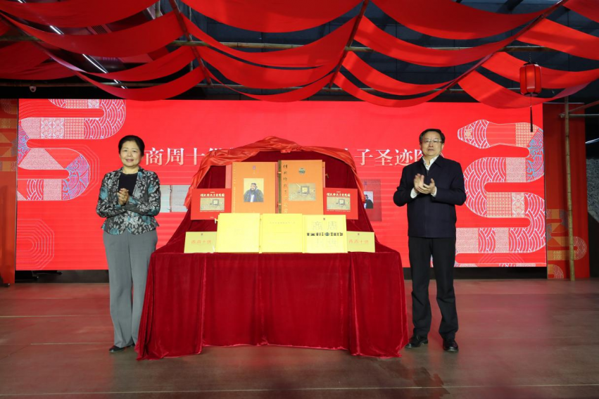 国承彦、刘文强为新书《商周十供》《明彩绘孔子圣迹图》首发揭幕。