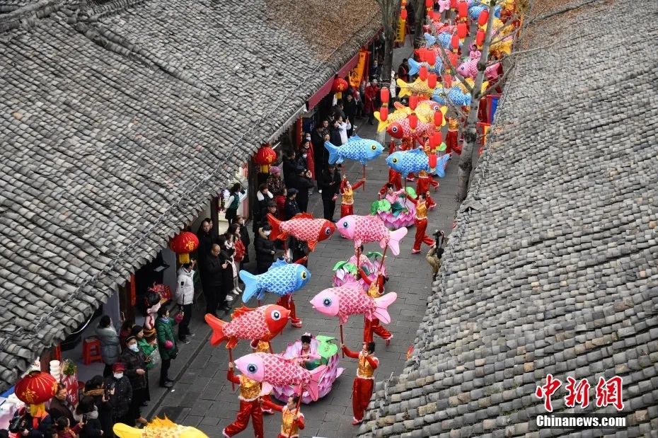 作为春节文化的发源地,四川阆中不仅保存着众多与春节相关的历史遗迹,更将这份传统融入小城的每一个角落。图为文艺工作者在阆中古城表演花灯节目。CNSphoto 王玉贵 摄