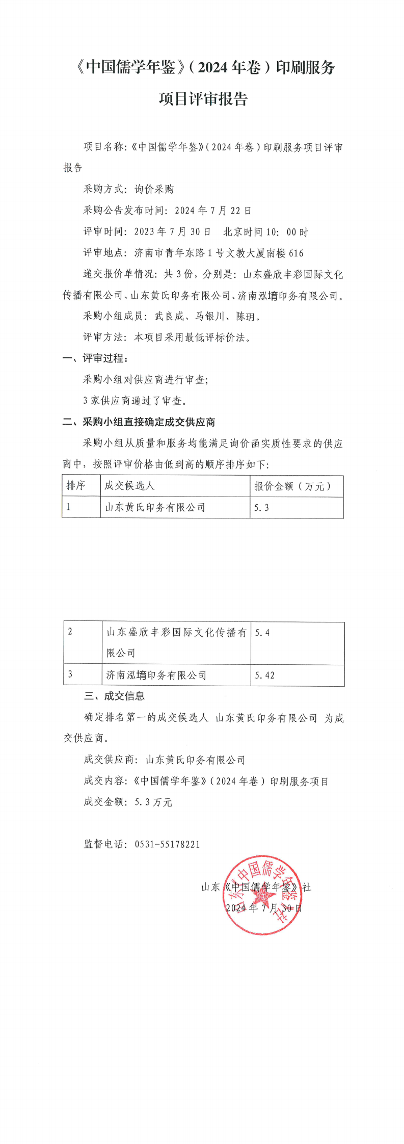 《中国儒学年鉴》(2024年卷)印刷服务项目评审报告