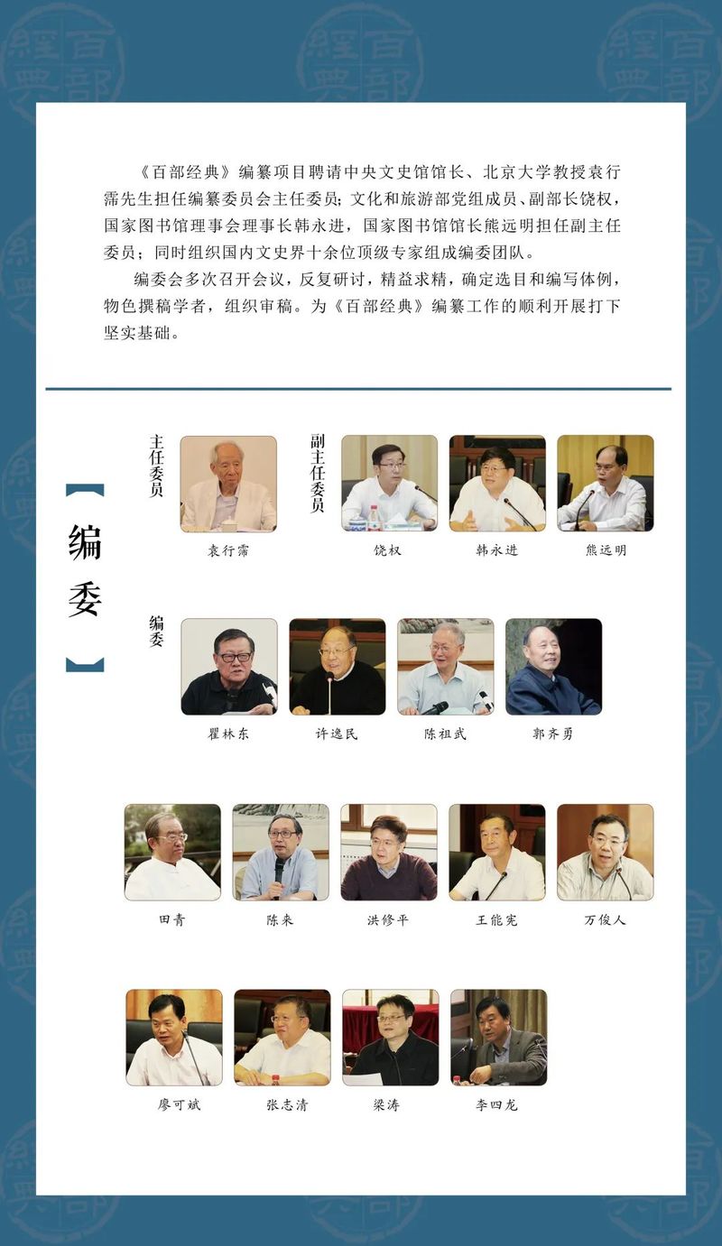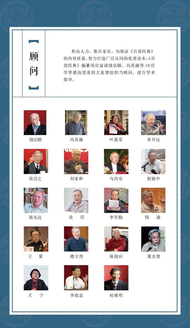 《中华传统文化百部经典》由中央文史馆馆长袁行霈先生担任主编,延请饶宗颐、冯其庸、叶嘉莹、章开沅、张岂之、刘家和、程毅中、李学勤、钱逊、王蒙、楼宇烈、陈鼓应等学界德高望重的大家耆宿担当顾问,进行学术指导。同时国内文史界10余位造诣深厚的专家学者瞿林东、陈祖武、许逸民、郭齐勇、田青、陈来、洪修平、王能宪、万俊人、廖可斌、张志清、梁涛、李四龙等组成编委团队。每一种经典都延请国内研究该文献的权威专家进行解读,如余敦康解读《周易》、钱逊解读《论语》、陈鼓应解读《庄子》、黄朴民解读《孙子兵法》、张双棣解读《吕氏春秋》、赵逵夫解读《楚辞》、刘成国解读《王安石集》、郁贤皓解读《李白集》、周育德解读《牡丹亭》、马瑞芳解读《聊斋志异》、李汉秋解读《儒林外史》等等。为了打造优秀的中华传统文化普及读本,编纂过程中每部书都成立审订小组,由两到三位同行专家审议修订,力求积众人力、集百家长,所以每部书既是作者的个人著作,也是一部众多学者集体的著作。袁行霈先生谈到这套书的特点时,概括为八个字:“激活经典熔古铸今”,他说:“《中国古籍总目》收录中国的古籍将近20万种,记录了古人的思想、生活,体现了他们的智慧。我们编纂这套书的目的就是从中选取大约100部加以导读、注释和点评,帮助读者理解,以增强文化自觉和文化自信。”《尚书》解读人钱宗武先生表示:“在当下,聚合全国优秀的学者,做这样一套既立足学术又面向大众的丛书,是颇具历史使命感的作为。更应该全力做好,做成流传后世的经典。”《百部经典》既追求学术上的高水准,又力求古为今用,让传统优秀文化贴近现实,走进人们心中。