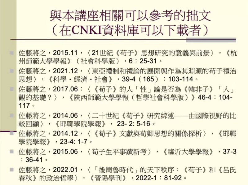 2022年3月15日,北京大学高等人文研究院“精神人文主义·云讲堂”第27讲在线上举行,题为“为了实现儒家精神人文主义的荀子礼治思想”。本次讲座由台湾大学哲学系佐藤将之教授主讲,北京大学高等人文研究院副研究员、长江商学院研究学者王建宝博士主持。