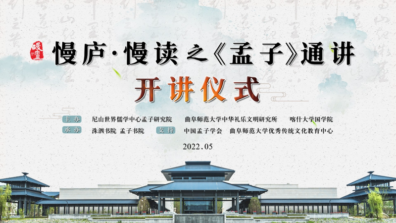 2022年5月21日下午,由尼山世界儒学中心孟子研究院、曲阜师范大学中华礼乐文明研究所、喀什大学国学院联合主办,洙泗书院、孟子书院承办的“慢庐·慢读”之《孟子》通讲启动仪式暨通讲第一期在孟子研究院举行。曲阜师范大学中华礼乐文明研究所所长宋立林,孔子研究院研究员魏衍华,尼山世界儒学中心孟子研究院副院长袁汝旭,孟子书院执行院长殷延禄等出席了本次活动。此外,数百名专家学者、儒学爱好者通过线上、线下的方式参与了此次活动。