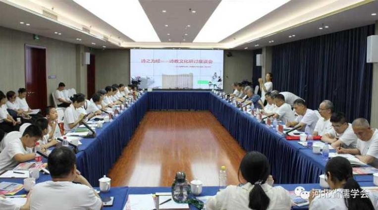 在当地著名企业——国欣农村技术服务总会(简称国欣总会)的支持下,“诗之为经――诗教文化研讨座谈会”在国欣会议室举办。座谈会由河北省儒学会梁世和副会长主持。丁彦兵、张伟峰、孙宇媚、王媛、张志强等第二期儒家经典研读班同道,首先分享了从经学角度的学诗心得,受到与会专家们的肯定和赞誉,也让大家感受到儒学会经典研读班“正本清源”的学习特色。座谈会上,著名作家闻章先生用“真诚”诠释了“诗无邪”,并提出要将人心的纯净、透亮、庄严作为读诗修身的追求。河间诗经斋主田国福先生表达了对传承中华优秀传统文化的殷切期待,燕赵诗社社长郭庆华先生阐述了诗经与现代生活的结合与应用,燕赵诗社副社长王律先生以诗经体即席赋诗一首以表达此行感受,燕赵诗社秘书长杜志勇先生、作家刘学斤先生也结合自身经历畅谈了学诗体会。梁世和副会长最后总结说:“儒学是经世致用的,诗经诗教,用之乡人,用之邦国。‘温柔敦厚’是诗教的作用,‘温柔敦厚而不愚,则深于诗者也。’我们当代人学诗、学儒,应在致用的转化上多下功夫。”座谈会后,研学团全体成员齐诵《小雅·天保》,祈福中华文化“如月之恒,如日之升!”同时感谢田国福先生、国欣总会诸同仁一天来给予的诸多帮助和支持。