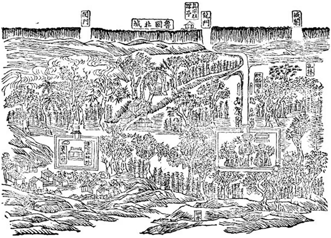 可见,《阙里文献考》载永乐二年衍圣公孔彦缙“作墓门三间”,显然时间上有误。永乐二年(1404),孔彦缙尚未袭封衍圣公,况且年方4岁,对于孔林扩建斋厅、做墓门一事,断不可为。亦如《孔林历史文化解读》所疑:“明永乐二年(误……因孔彦缙永乐八年才袭封衍圣公)。”但是《孔林历史文化解读》提出金代孔林图中就已有此门,是否就是如此呢?