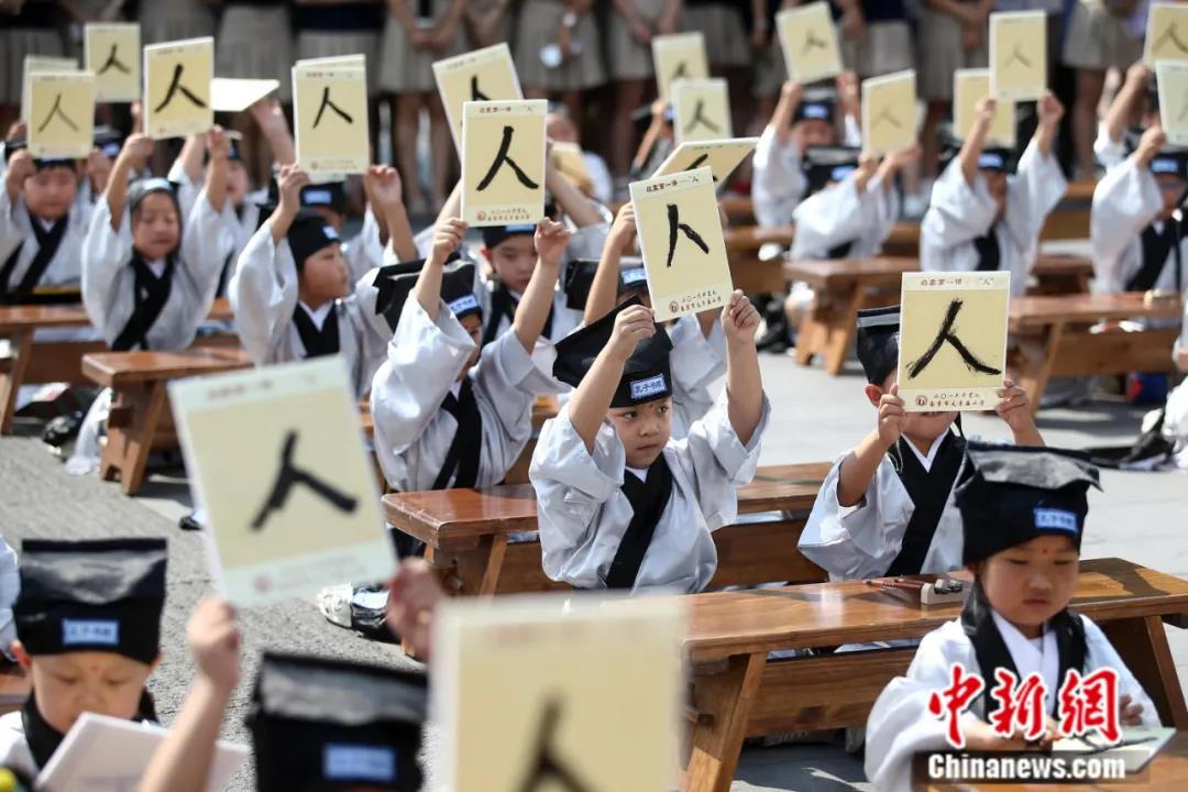 2016年8月31日,百余名小学新生齐聚南京夫子庙大成殿前“开笔破蒙”。中新社记者 泱波 摄