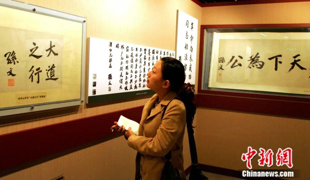 2006年,参观者在上海观看孙中山手书“大道之行”、“天下为公”真迹。中新社记者 潘索菲 摄