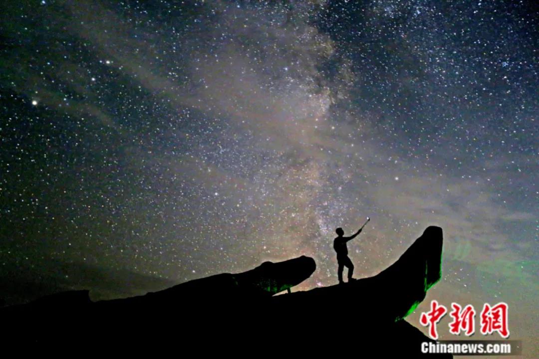 2021年9月,首届新疆哈密星空摄影采风暨摄影大赛在哈密雅丹景区启动,摄影师在拍摄星空。中新社发 蔡增乐 摄