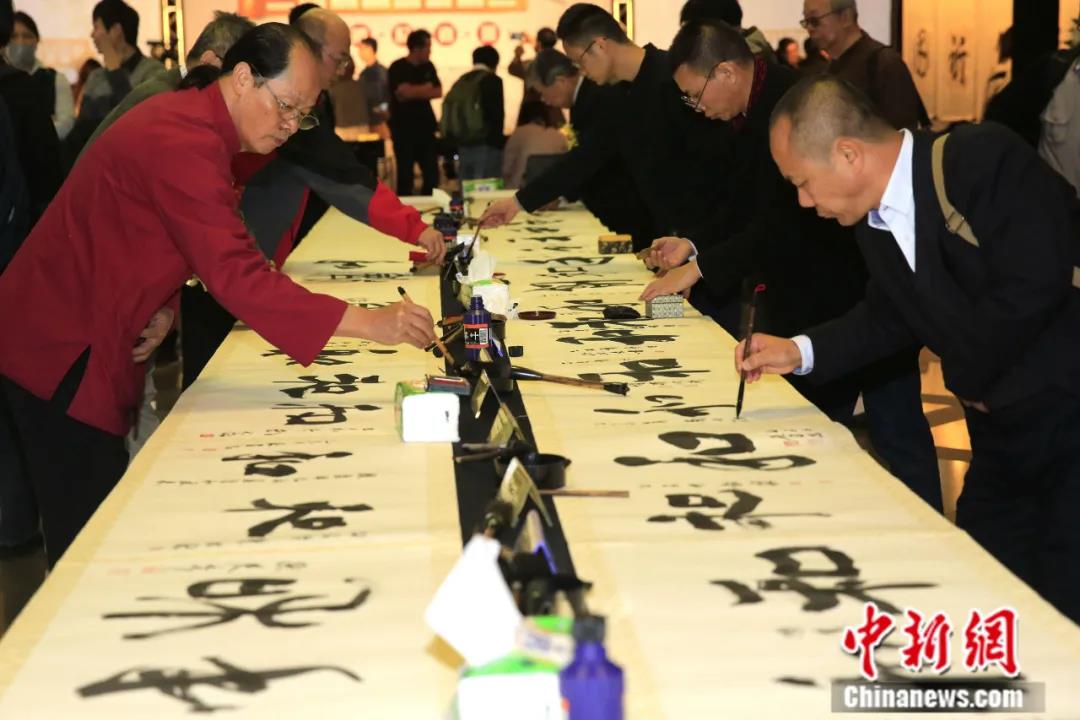 2015年12月, “2015海峡两岸年度汉字评选”在台北揭晓,“和”字以433722票当选。两岸书法家现场挥毫,以不同字体书写“和”字。中新社记者 陈小愿 摄