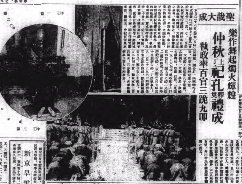 1933年9月28日,伪满洲国为笼络民心,营造“王道乐土”的假象,高规格举办祭孔活动,溥仪亲自主祭。日本侵略当局极力吹捧此举之意义,甚至主观地认为其人心感化作用将及于全中国。如关东军司令官、驻伪满大使菱刈隆在给外务大臣广田弘毅的报告中,建议进一步利用尊孔活动笼络中国民心: