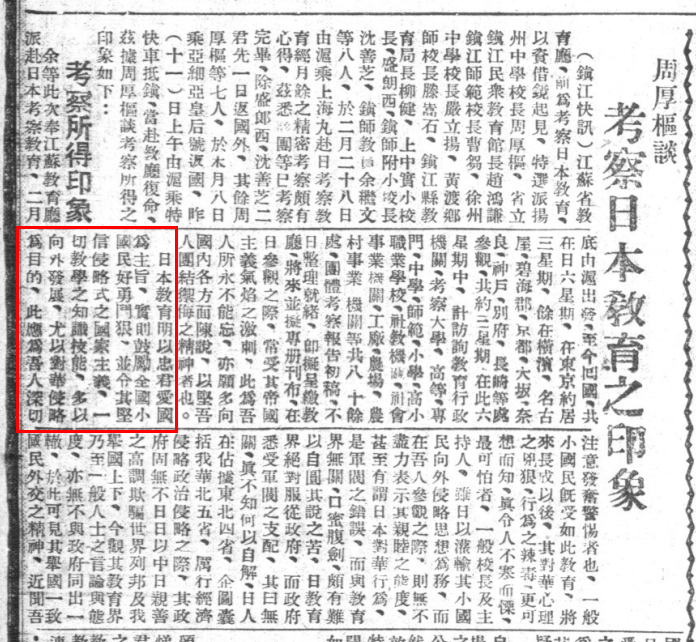 1934年3月,江苏省教育厅派教育管理人员9人赴日考察教育。作为事变后首个官方考察团,一行以“洞悉日本非常时代教育之真相”为使命,对日本教育之侵略性高度关注。团长周厚枢认为,日本教育“一切教学之知识技能,多以向外发展,尤以对华侵略为目的”,提醒国人“奋发警惕”。在考察过程中,周厚枢侦知日本拟召开儒道大会、邀请衍圣公东渡参加典礼的计划(从其考察中与外务省文化事业部有接触,且该部职司儒道大会方案制定,可推知其消息应源自此处)。归国后,周厚枢等将考察情形和日本尊孔阴谋报告给国民党当局,受到高度重视,行政院院长汪精卫专门为其考察报告集《江苏教育——考察日本教育专号》题写书名。蒋介石亲信、江苏省政府主席陈果夫当即将周厚枢之情报函告蒋介石,并建议由政府提倡尊孔,以抵御文化侵略。他后来回忆说: