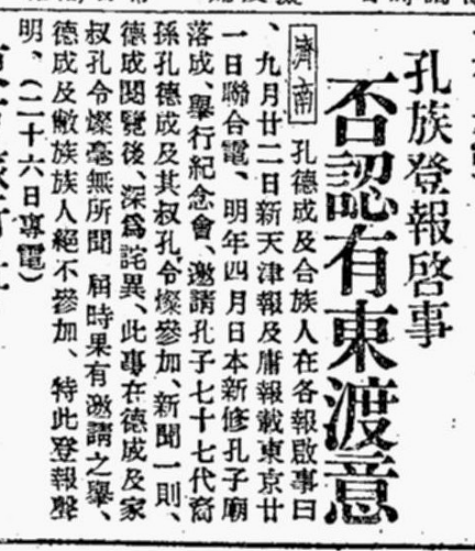 对于国民政府加速尊孔与日本拉拢圣裔之关联,中日两国舆论有充分之认识,多将两者相提并论。如《申报》新闻《衍圣公孔德成拒绝日人诱惑》标题下有“鲁省修复孔庙会议进行中”之副标题;该报还以“日人劝曲阜衍圣公孔德成赴日引起各方注意”为背景,详细介绍了国民政府修复孔庙、整理孔氏田产的动向。井上哲次郎也认为,南京国民政府“本年对孔、颜二氏子孙大表敬意,无论如何思考,都无外乎是受到儒道大会之影响”。尽管我们可以认为孔庙已受损有年,对其进行修复与日本无必然关系,可是,若不抢先将衍圣公纳入国民政府体系,即无理由限制其东渡,两者关联不言自明。