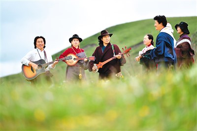 在甘肃省甘南藏族自治州玛曲草原上,艺人尕藏扎西(中)和同伴在弹唱格萨尔。新华社记者 陈 斌摄