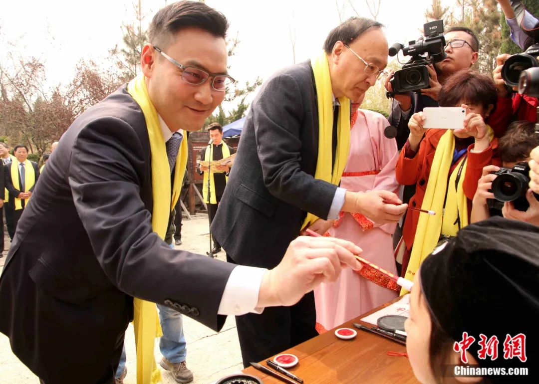 2016年4月2日,丙申年春季祭孔大典在孔子出生地山东曲阜尼山举行,孔垂长(左)为参加当天开笔礼的学童点朱砂启智。李欣 摄