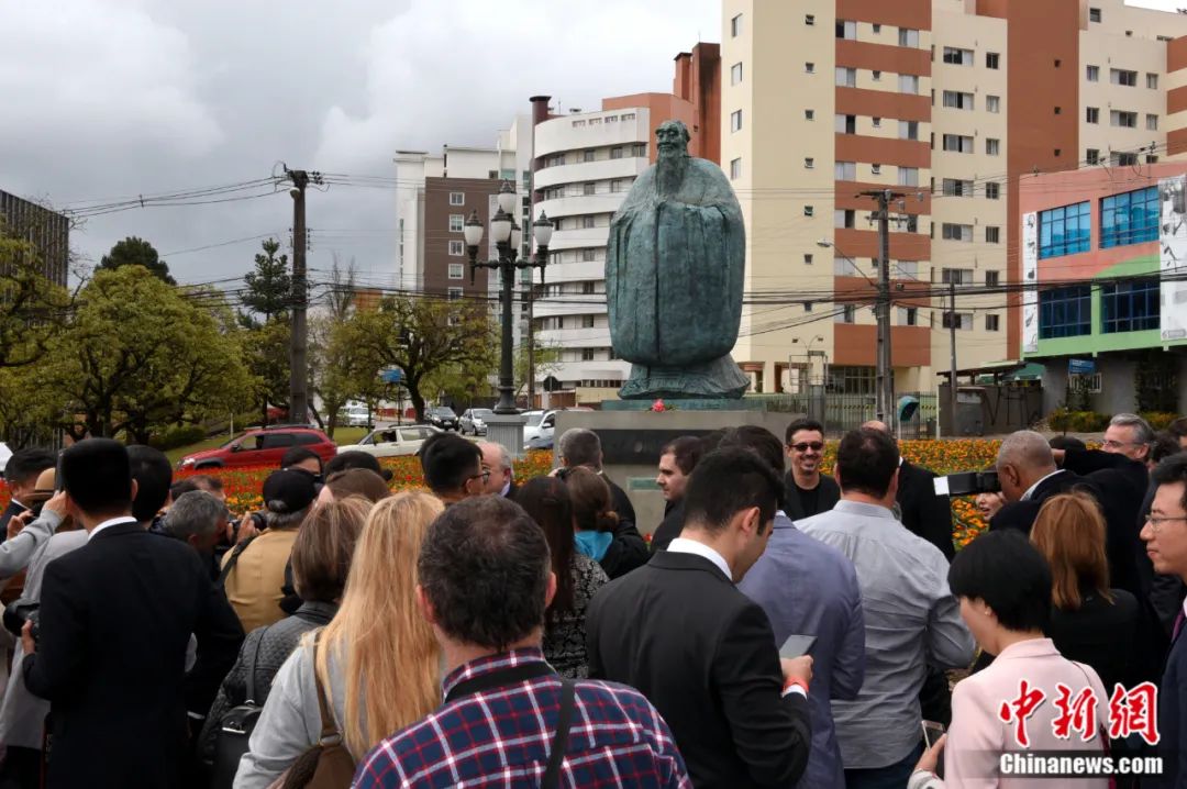 2017年9月30日,由中国美术馆馆长吴为山创作的孔子青铜雕像在巴西巴拉那州首府库里蒂巴市“中国广场”落成。莫成雄 摄