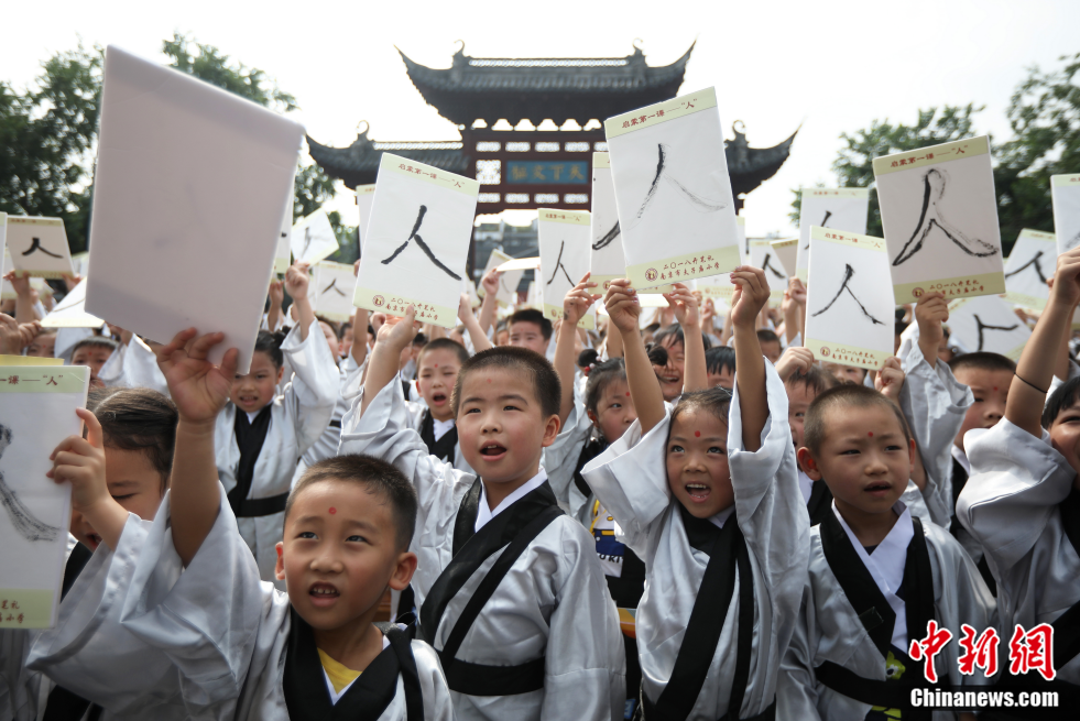 南京夫子庙小学的一年级新生来到夫子庙大成殿前举行开笔礼,孩子们通过祭拜孔子、学写“人”字等仪式,接受“尚礼”传统文化教育。泱波 摄