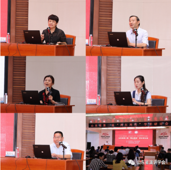 山东青年政治学院马克思主义学院院长刘丙元教授和山东省演讲学会副会长张健鹰分别主持了22日下午两个时段的大会发言环节。山东省演讲学会副会长周国柱教授、山东工商学院马克思主义学院副院长邓云副教授、东平县委党校常务副校长王玉堂教授、山东交通学院马克思主义学院王先亮、山东财经大学马克思主义学院毛玉美教授刘长明教授、山东体育学院马克思主义学院副院长张兴华教授、潍柴职业大学副校长潘伟唯、山东青年政治学院马克思主义学院邵西梅副教授等,作了大会发言,讨论了“学习领悟习近平总书记关于沂蒙精神的重要论述研究”、“演讲在红色文化传播中的作用”、“红色文化教育与高校思政课教学改革探索”、“红色基因的传承——信仰、信念、信心”、“讲好红色故事,提升思政水平”、“唱两红两传旋律,做一领四维文章”等问题,使与会者收获很大。
