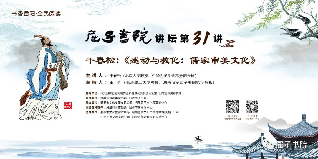 5月7日下午,屈子书院讲坛第31期在汨罗屈子书院沅湘堂开讲。北京大学教授、中华孔子学会常务副会长干春松与线下线上47万多观众分享了《感动与教化:儒家审美文化》。讲座由凤凰网湖南频道全程直播,长沙理工大学设计艺术学院教授、屈子书院执行院长王琦担任嘉宾主持。