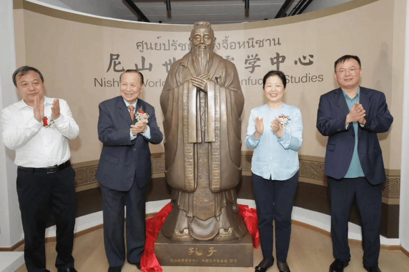 4月19日,国承彦一行来到泰国格乐大学,出席尼山世界儒学中心首家海外展厅揭牌仪式,与泰国外交部原部长、格乐大学校长Prof. Dr. Krasae Chanawongse,尼山世界儒学中心(中国孔子基金会秘书处)党委委员、副主任刘廷善,泰国格乐大学管理委员会负责人王长明共同为展厅孔子像揭幕,并宣布展厅正式启用。