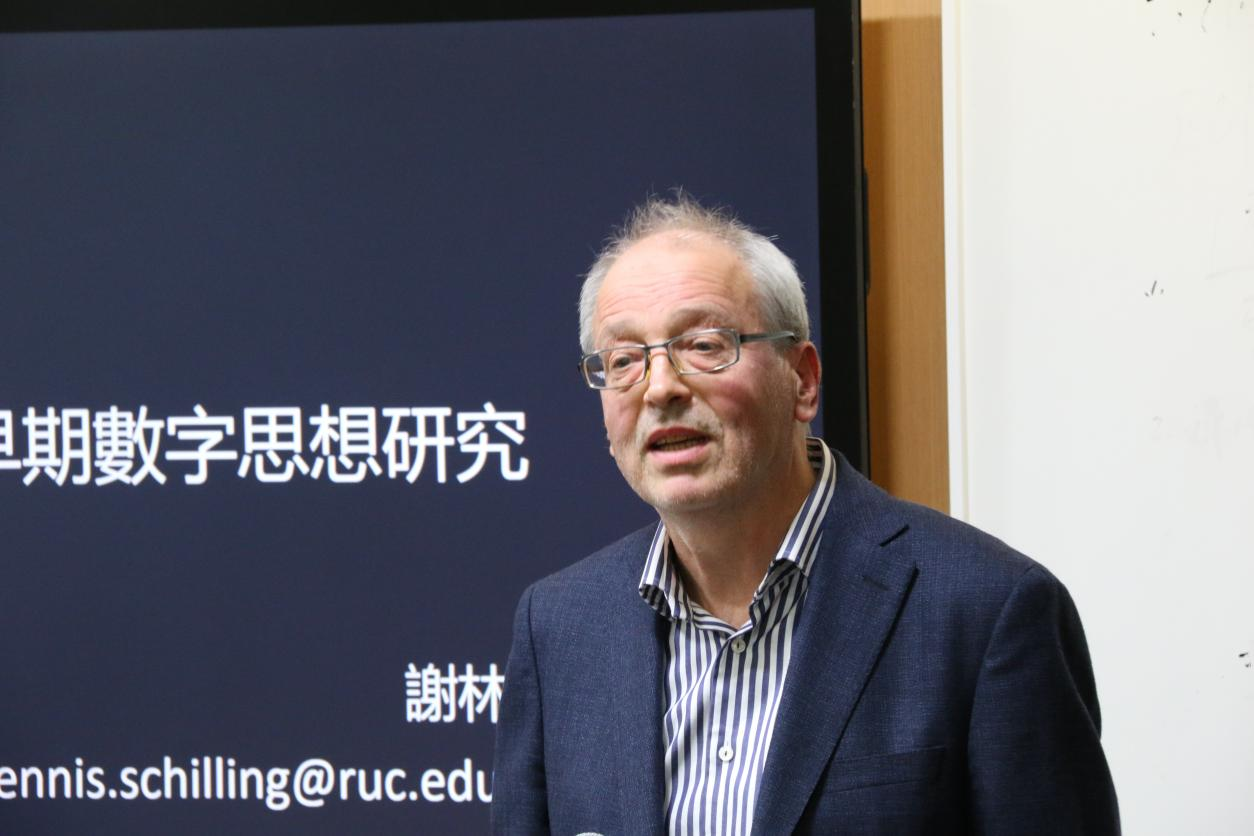 来源:中国人民大学哲学院 作者:冯龙涛 金瑜萌 汪刚迪 日期:2023-06-094月6日,中华优秀传统文化系列讲座课程“中华优秀传统文化新论”第七讲:“中国哲学中的早期数学思想研究”在中国人民大学立德楼603教室顺利举行。本场讲座由德国汉学家、中国人民大学新奥国际杰出教席岗位教授谢林德(Dennis Schilling)教授为同学们讲授,由中国人民大学刘增光副教授主持。讲座采取线下线上结合的方式,线上通过腾讯会议、B站同步直播。