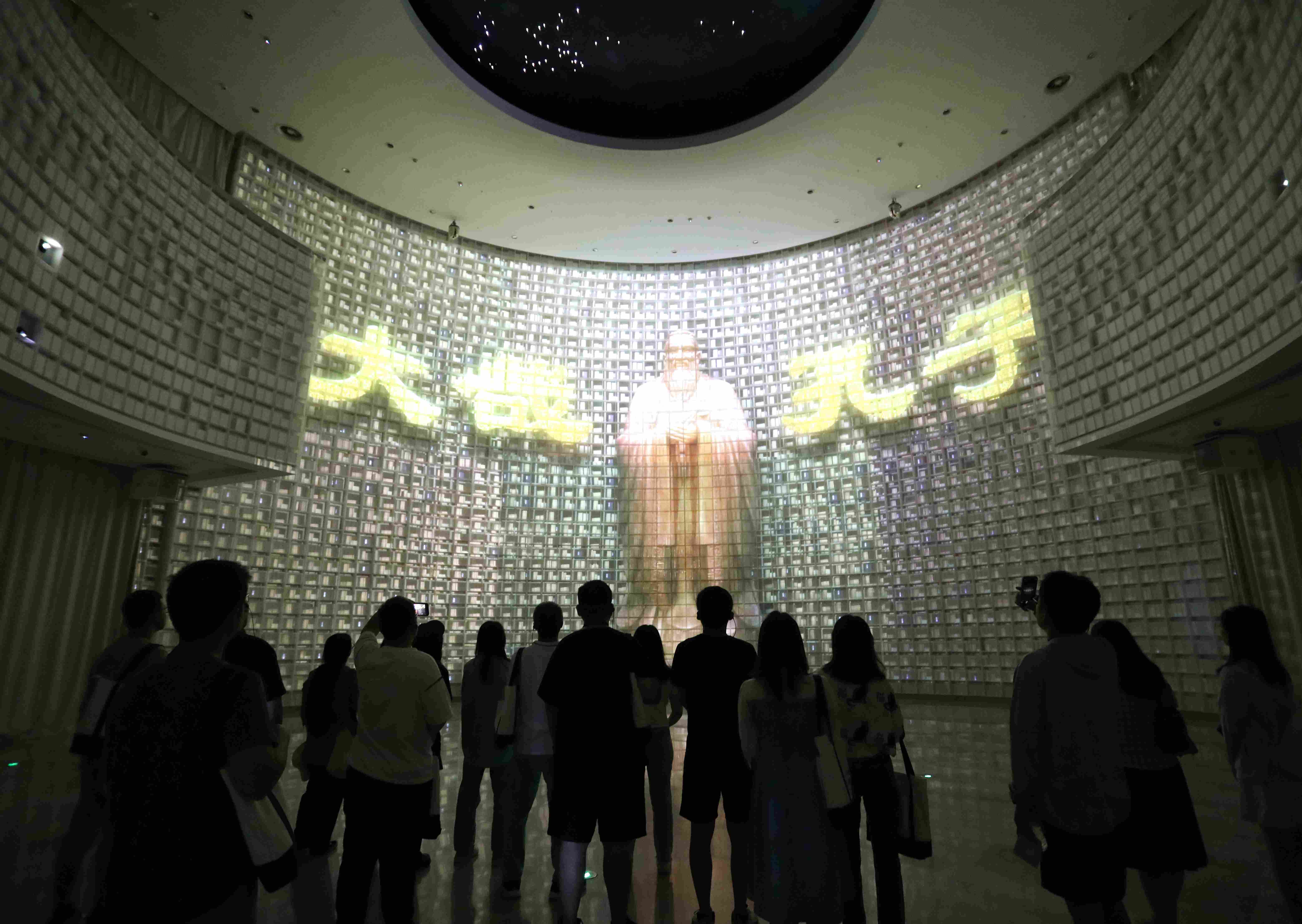 走进序厅,巨大的孔子像浮现在乳白色书墙上,在灯光变化下时隐时现;《孔子圣迹图》大型互动厅内,通过VR等技术生动演绎孔子周游列国的故事;与孔夫子“加微信”为你传道解惑,满满的科技感,让专项研究生们对儒家文化有了更加生动、立体、直观的体验。