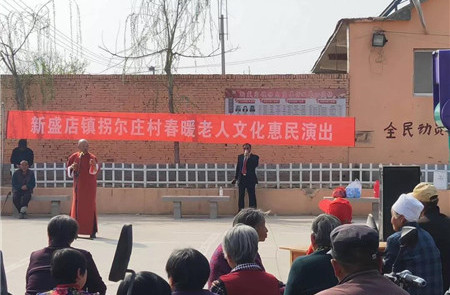 草木蔓发,春暖花开。农历三月初三,山东省拐尔庄村孔子学堂举办文艺演出活动为村内老人庆生。当日新盛店镇拐尔庄村文化广场人头攒动,全村80岁以上老人齐聚一堂,共同度过了一个有意义的生日聚会。这是村里第八个年头给老人过生日了,此次新盛店镇文化站邀请县文化局文艺演出队为老人带来精彩的节目,演出人员热情激昂,现场老人喜笑颜开,双方频频互动,气氛热烈浓厚。演出队以丰富多彩,生动有趣的节目内容,给老人们送来了一场别样的生日祝福。表演现场,评书、歌曲、小品、相声、竹板大鼓等一出出精彩纷呈的节目让老人们陶醉其中,不觉拍手叫好。