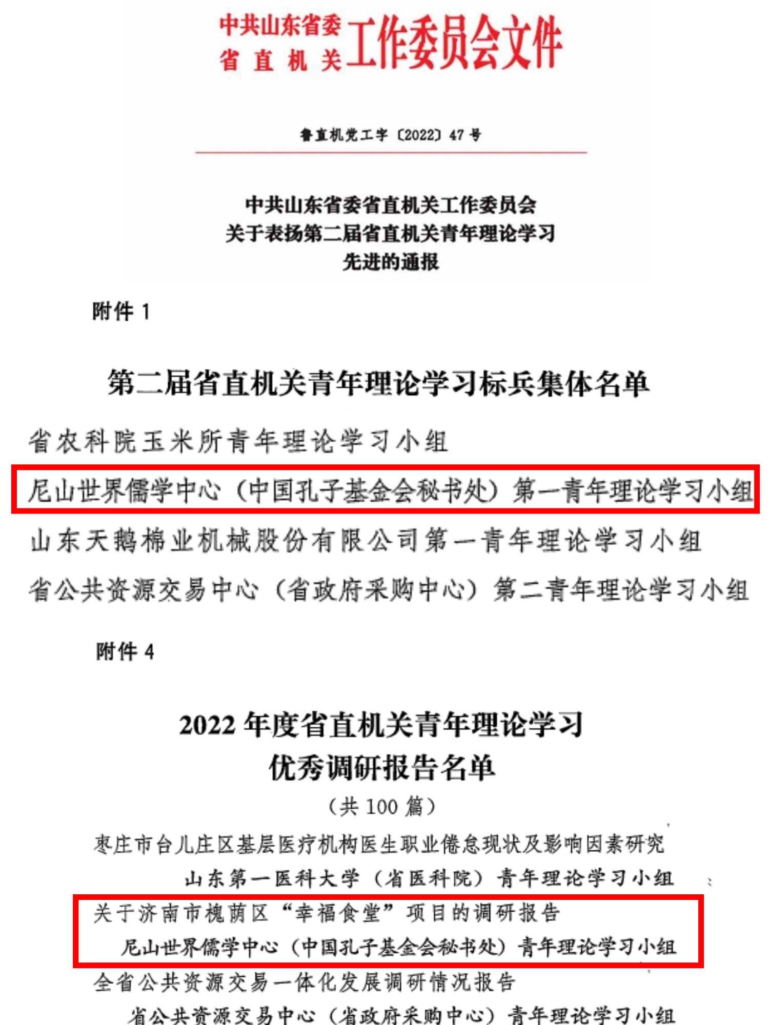 积极参加省直机关工委组织的“第二届省直机关学习标兵集体”评选活动,组织青年干部参加“省直机关青年干部‘知行合一’调研实践活动”,其中尼山世界儒学中心(中国孔子基金会秘书处)第一青年理论学习小组获评“第二届省直机关学习标兵集体”称号,《关于济南市槐荫区“幸福食堂”项目的调研报告》获评“2022年度省直机关青年理论学习优秀调研报告”。