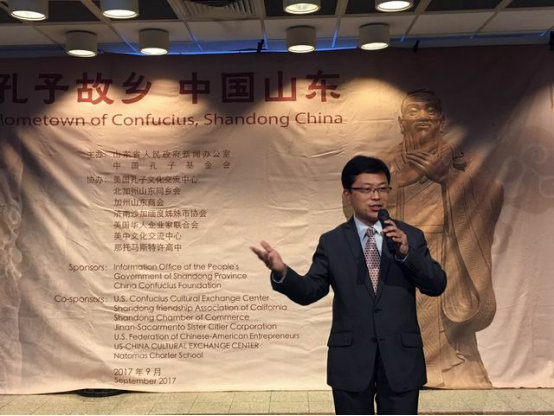 萨卡拉门托市国庆升旗委员会主席罗东民先生在致辞中说“我很荣幸访问过中国三次,发现了中国的巨大变化。值得一提的是这三次我都去过山东,去了济南,去了孔子的故乡曲阜,我对曲阜的印象特别深。萨卡拉门托市被《时代》杂志评选为各族裔最融洽相处的城市,我们加州可以向孔子思想学习的地方有很多。孔子文化2500多年以来,完整、稳定的传承下来,是加州应该学习的。”