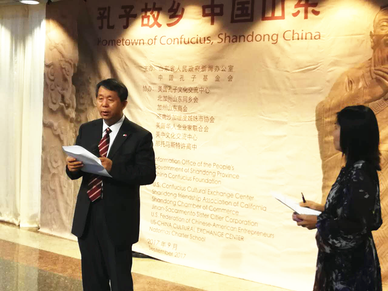 美国当地时间9月27日,“孔子故乡·中国山东”文化节开幕式在加州州府萨克拉门托市公共图书馆举行,中国驻旧金山副总领事任发强、中国孔子基金会副理事长牛廷涛、萨克拉门托市前市议员Steve Cohn、北加州山东同乡会会长张汝惟、加州山东商会理事长孟毅军及加州政界、商界、学界、侨界代表等近百人出席活动。