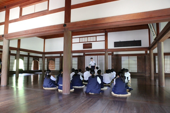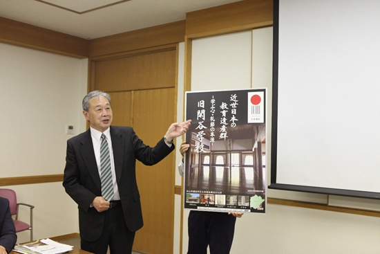 特别史迹旧闲谷学校显彰保存会理事长国友道一先生对中国孔子基金会文化交流团一行的到来表示热烈欢迎,他向大家介绍了闲谷学校的基本情况:闲谷学校是于江户时代前期1670年由冈山藩主池田光政创建的一所最早的为平民设立的公立学校,以开展孔子思想教育为核心,现在主要是为中小学生及成人等提供研修学习孔子思想的平台,学校会向学生发放《论语》手册,每天上课前还会单独安排阅读《论语》的时间。