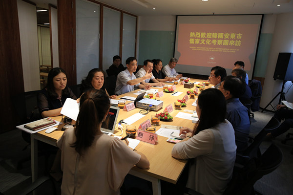 孙在完团长介绍了在建的世界儒教文化博物馆的有关情况,表达了同我会合作开展儒家文化研究交流的愿望。康承宝同志介绍了中国孔子基金会在传承和弘扬儒家文化方面所做的工作以及与韩国有关方面和安东儒学界的交往交流情况,表示愿意加强同包括韩国世界儒教文化博物馆等各方的友好交流。我会学术部主任彭彦华、交流合作部主任邹丽妍分别介绍了学术和对外交流的重点项目,中国孔子网主编王承山重点介绍了“儒家文化经典数字化工程”的情况及工作进展。