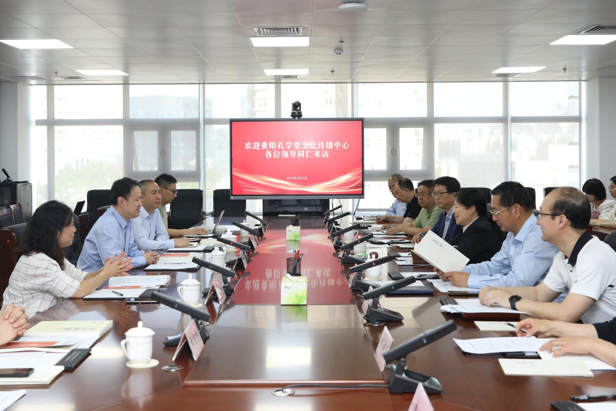 4月25日,贵阳孔学堂文化传播中心党委书记、主任,贵阳市委宣传部常务副部长戴建伟一行到访尼山世界儒学中心(中国孔子基金会秘书处)。尼山世界儒学中心(中国孔子基金会秘书处)党委书记、副主任,中国孔子基金会副理事长、秘书长国承彦亲切会见,双方围绕加强学术合作、联合开展文化活动、携手推动优秀传统文化普及传播等工作进行座谈交流。